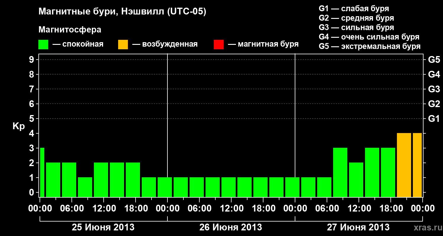 Изменения геомагнитного индекса Kp с 25 по 27 июня 2013 года для средних широт