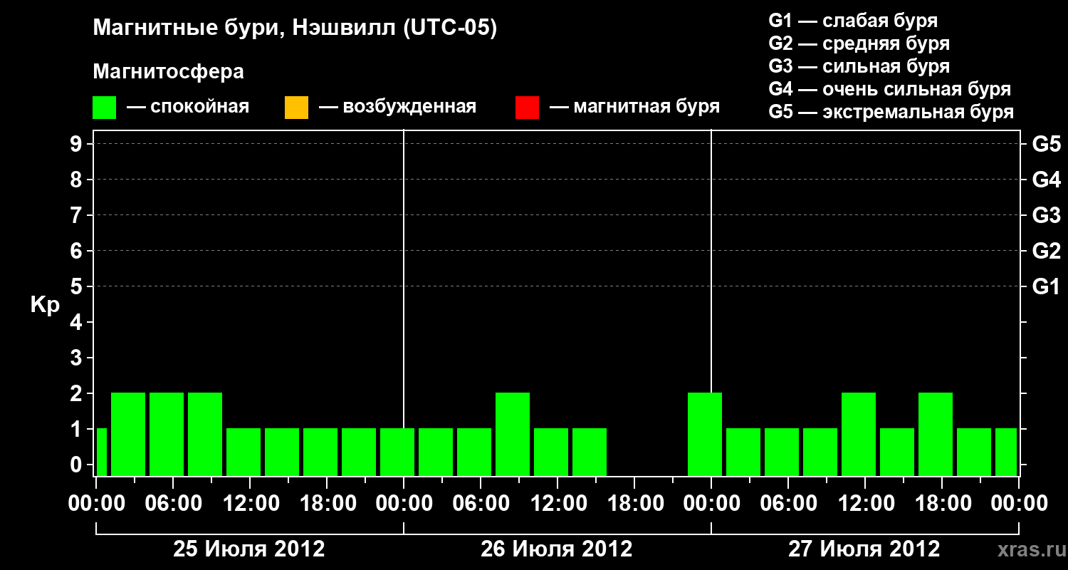 Изменения геомагнитного индекса Kp с 25 по 27 июля 2012 года для средних широт