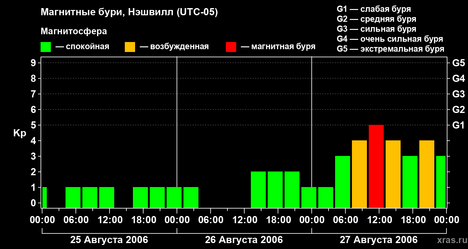 Изменения геомагнитного индекса Kp с 25 по 27 августа 2006 года для средних широт