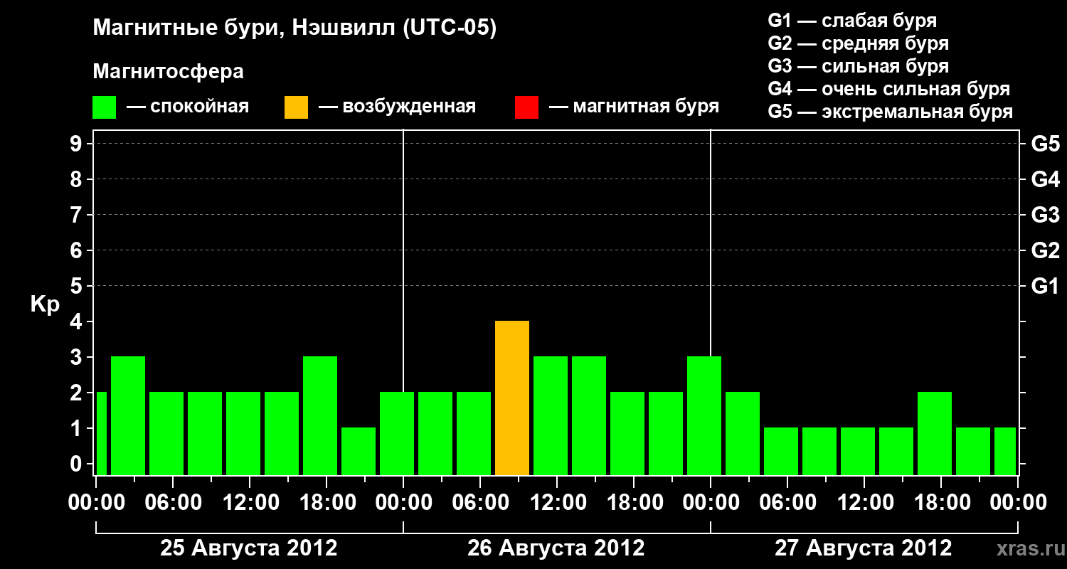 Изменения геомагнитного индекса Kp с 25 по 27 августа 2012 года для средних широт