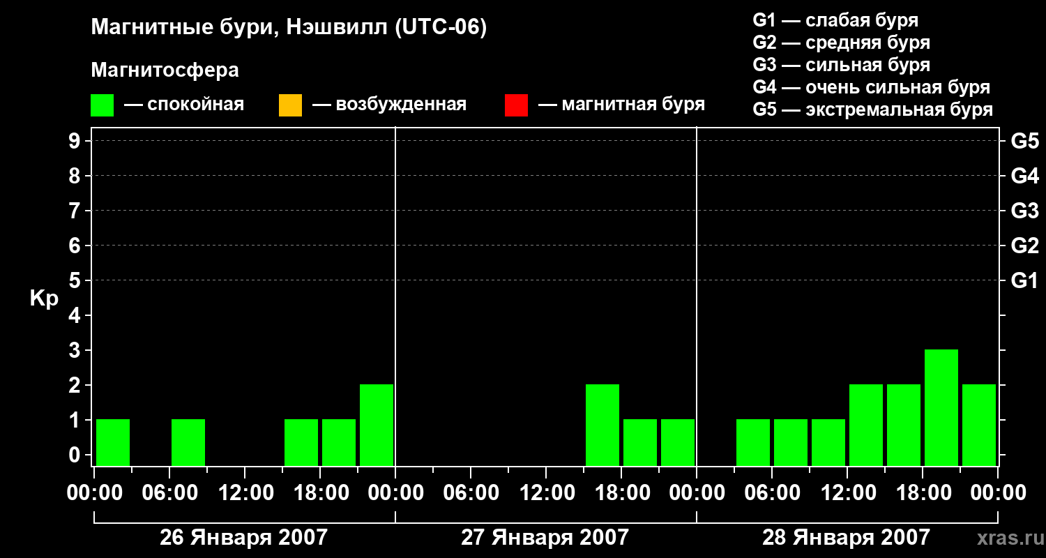 Изменения геомагнитного индекса Kp с 26 по 28 января 2007 года для средних широт