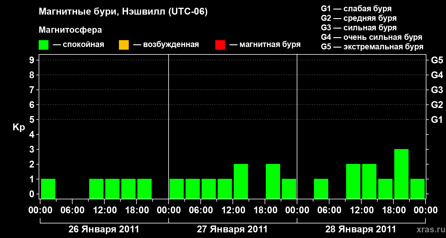 Изменения геомагнитного индекса Kp с 26 по 28 января 2011 года для средних широт