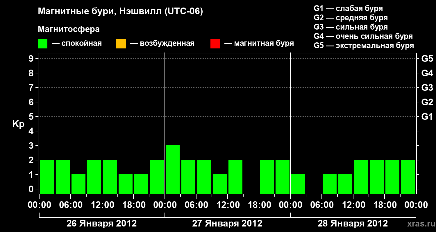 Изменения геомагнитного индекса Kp с 26 по 28 января 2012 года для средних широт