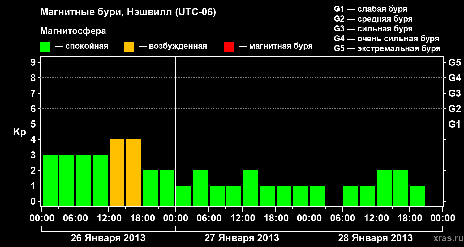 Изменения геомагнитного индекса Kp с 26 по 28 января 2013 года для средних широт
