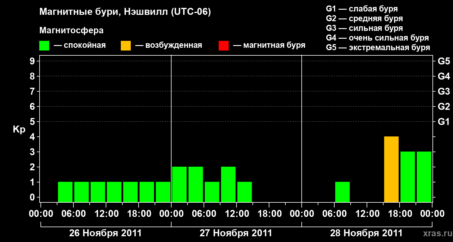 Изменения геомагнитного индекса Kp с 26 по 28 ноября 2011 года для средних широт