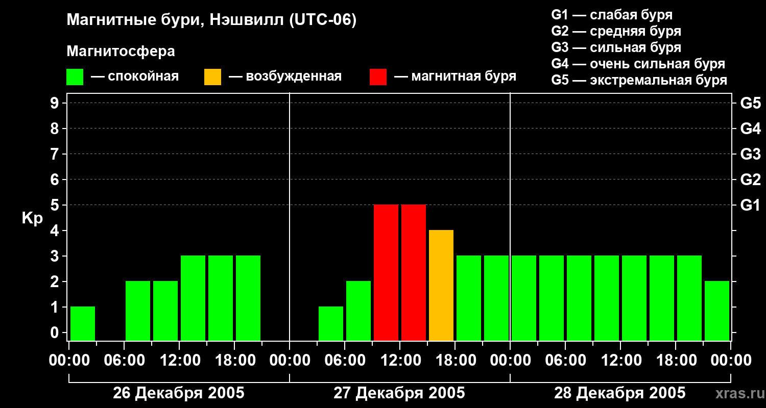 Изменения геомагнитного индекса Kp с 26 по 28 декабря 2005 года для средних широт