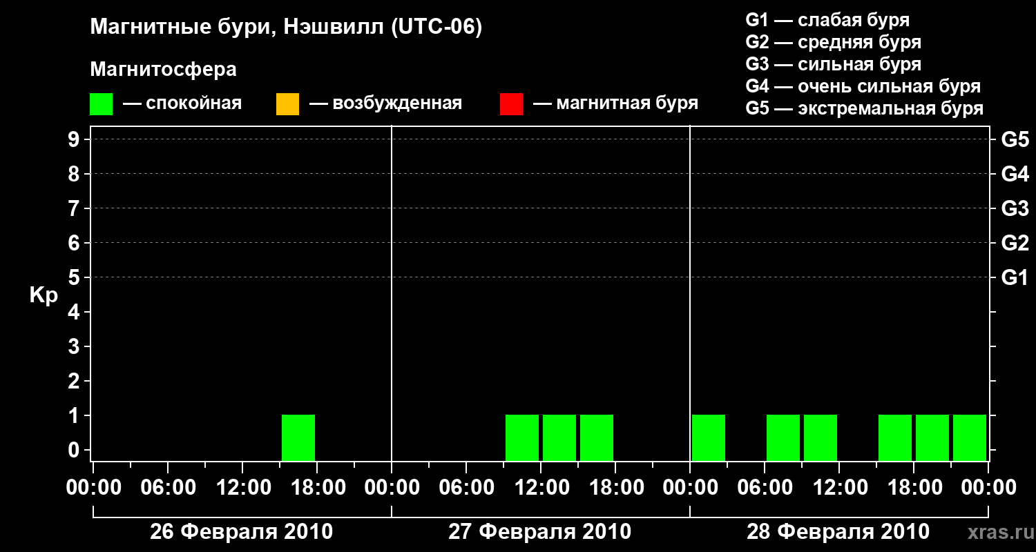 Изменения геомагнитного индекса Kp с 26 по 28 февраля 2010 года для средних широт