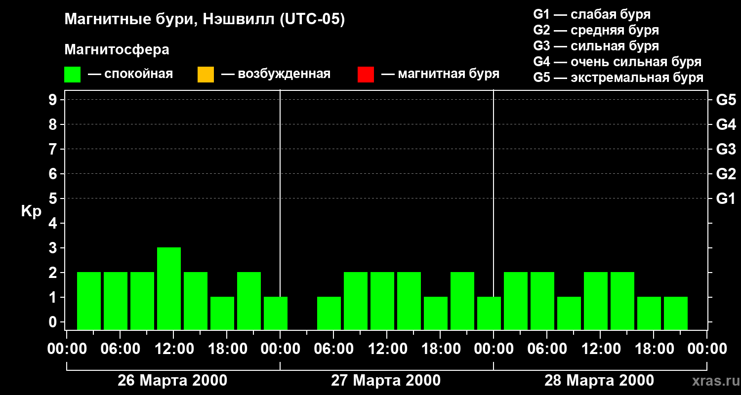 Изменения геомагнитного индекса Kp с 26 по 28 марта 2000 года для средних широт