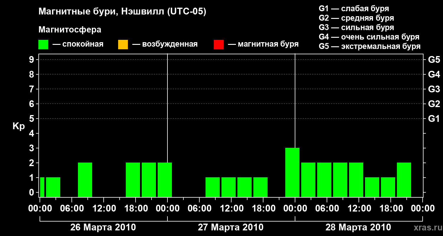 Изменения геомагнитного индекса Kp с 26 по 28 марта 2010 года для средних широт