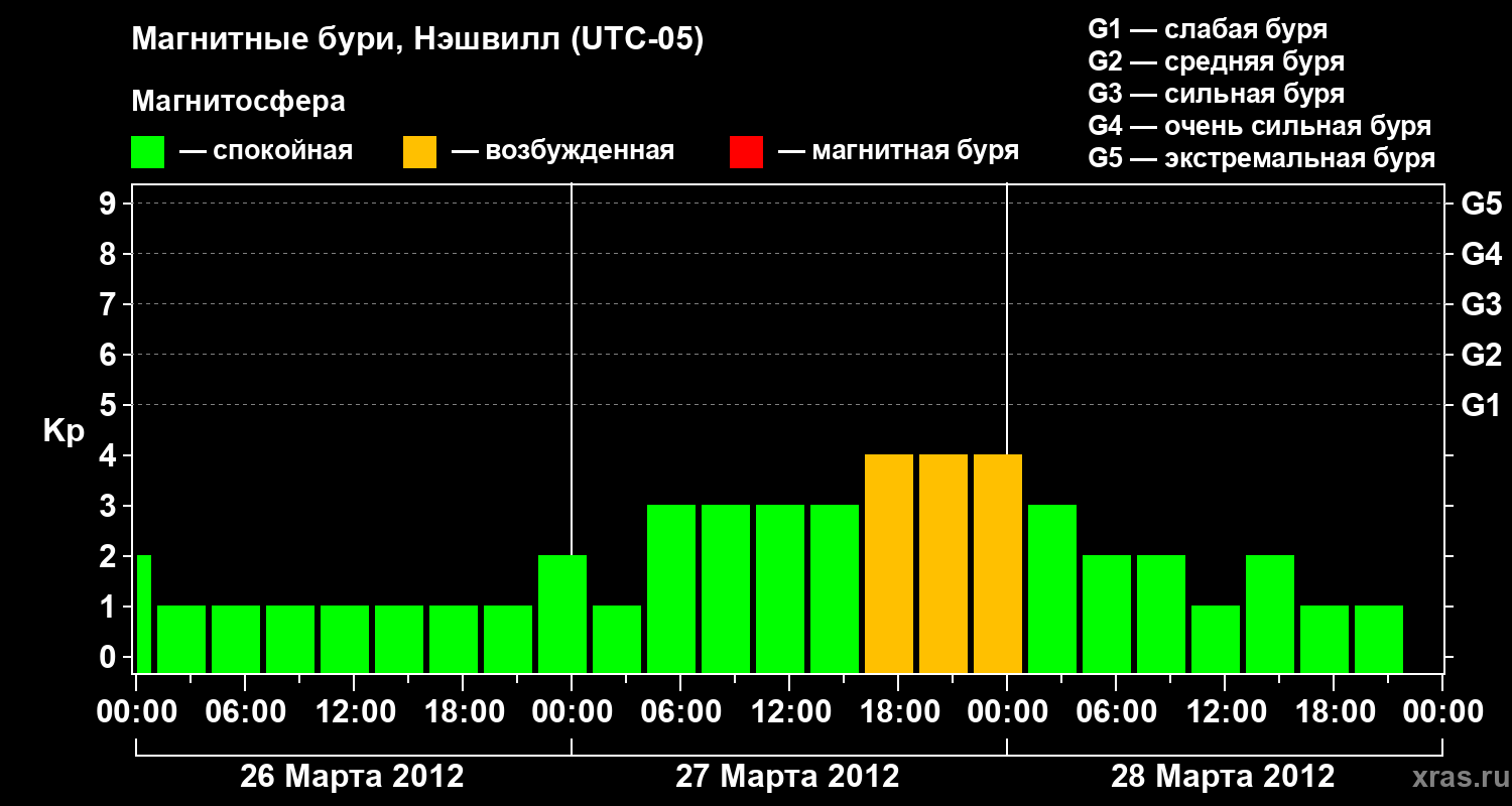 Изменения геомагнитного индекса Kp с 26 по 28 марта 2012 года для средних широт