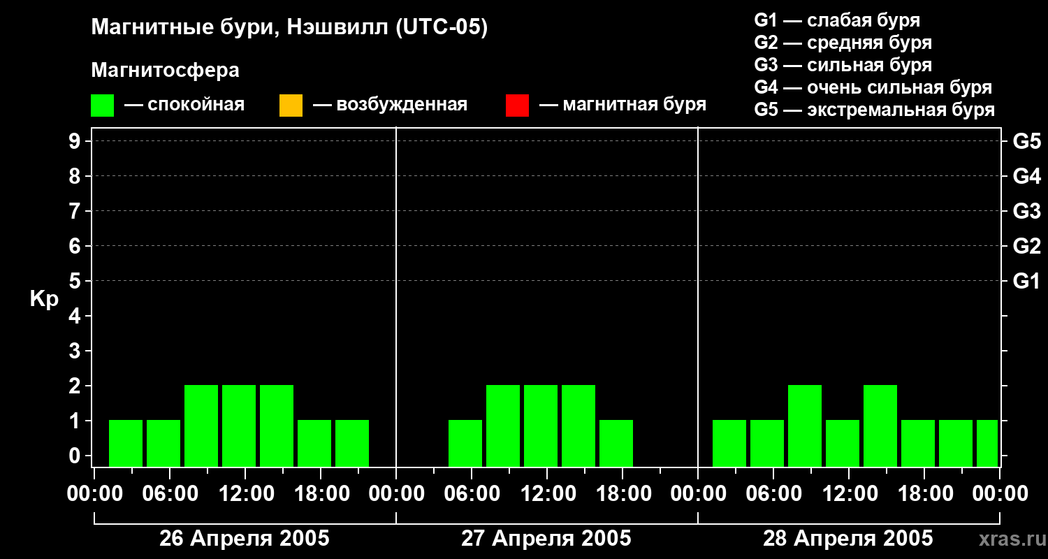 Изменения геомагнитного индекса Kp с 26 по 28 апреля 2005 года для средних широт
