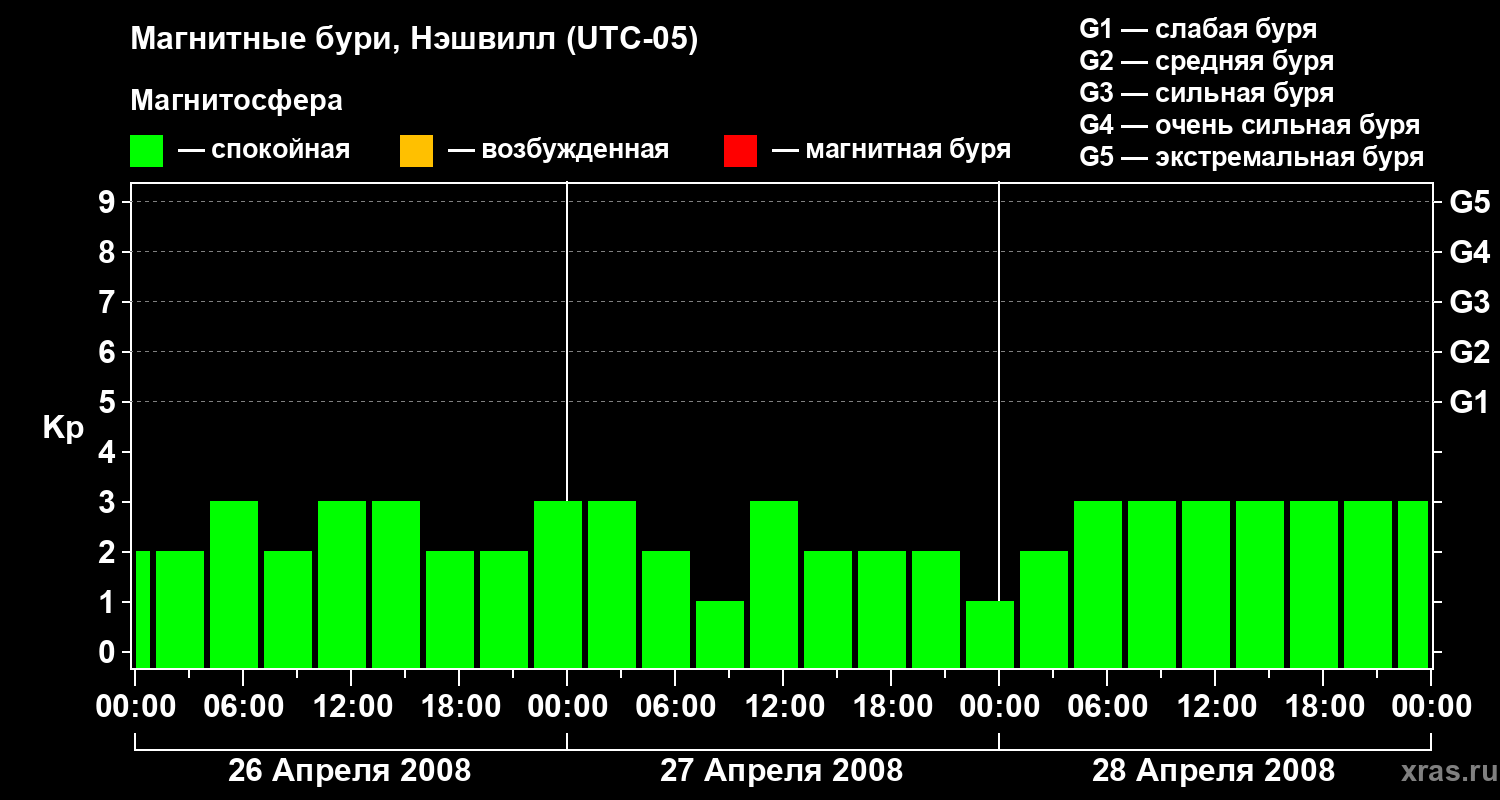 Изменения геомагнитного индекса Kp с 26 по 28 апреля 2008 года для средних широт