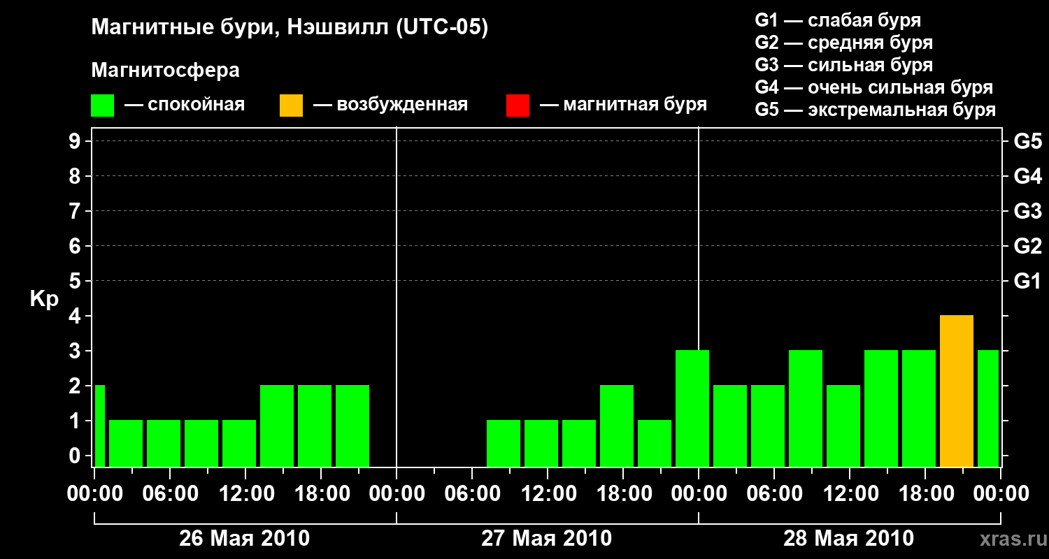 Изменения геомагнитного индекса Kp с 26 по 28 мая 2010 года для средних широт