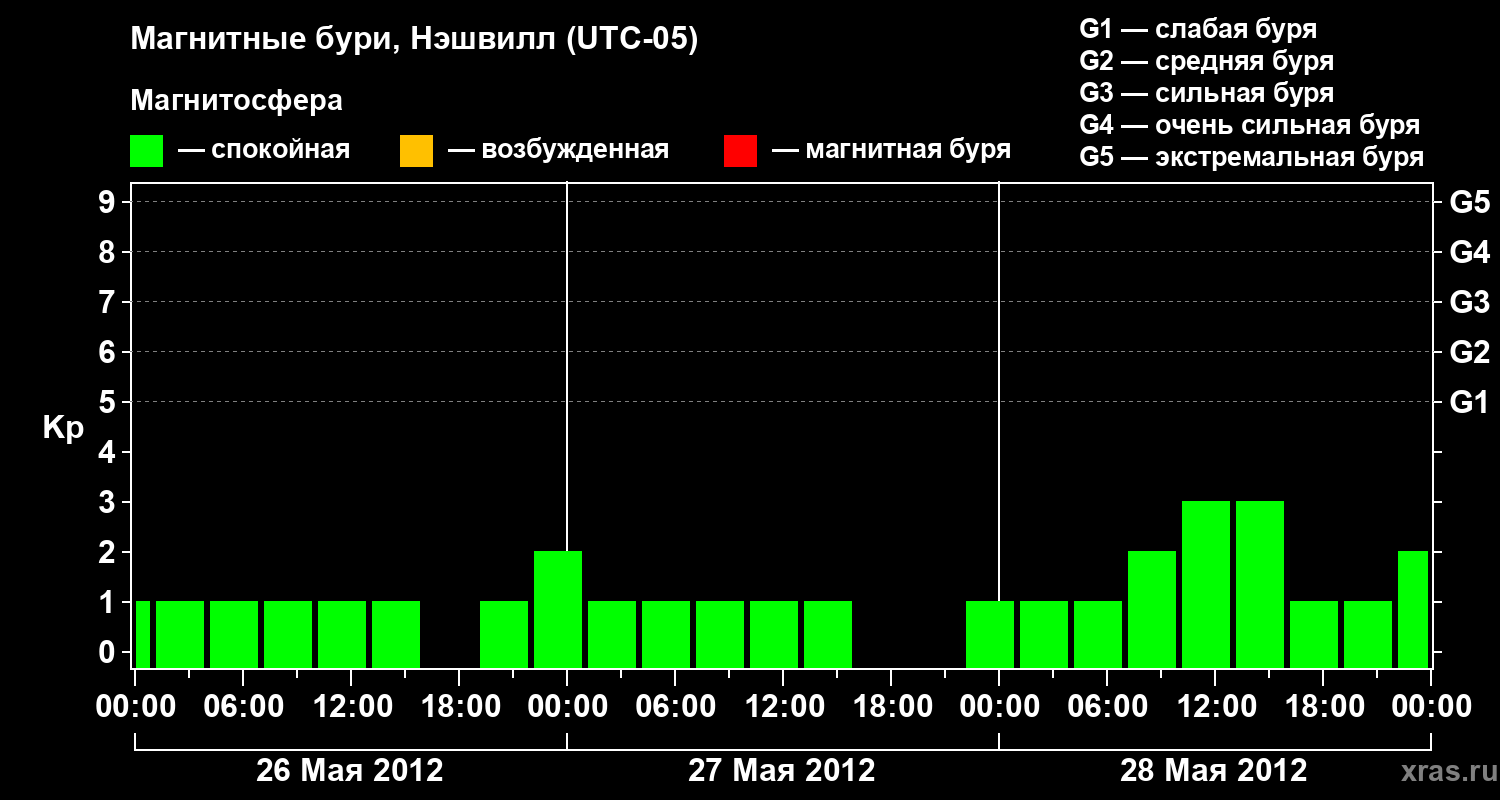 Изменения геомагнитного индекса Kp с 26 по 28 мая 2012 года для средних широт