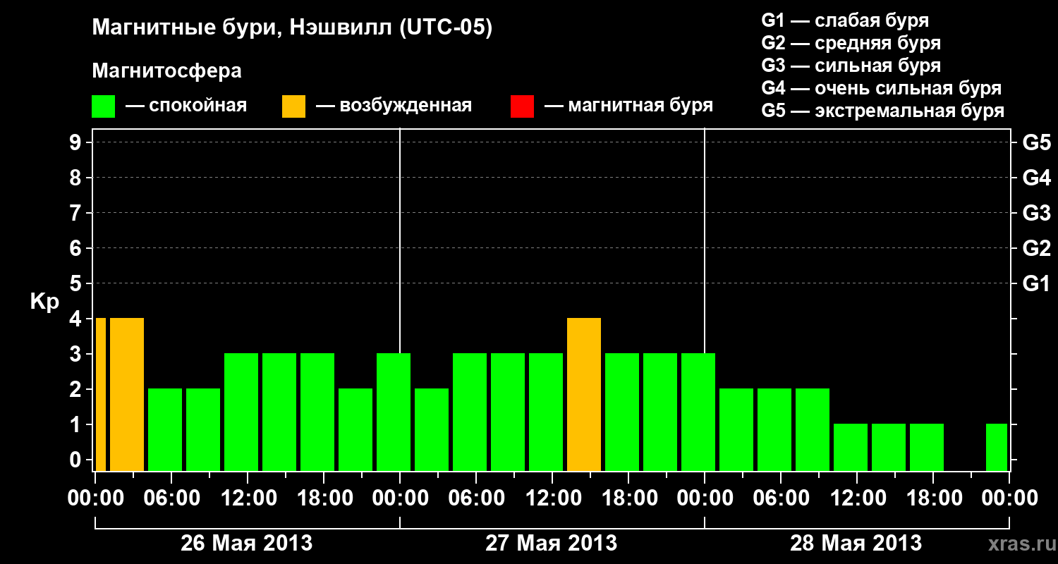 Изменения геомагнитного индекса Kp с 26 по 28 мая 2013 года для средних широт