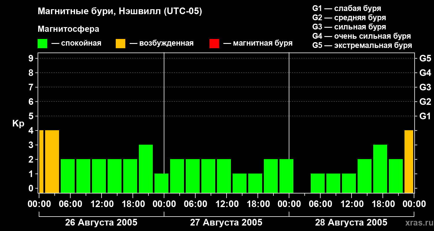 Изменения геомагнитного индекса Kp с 26 по 28 августа 2005 года для средних широт