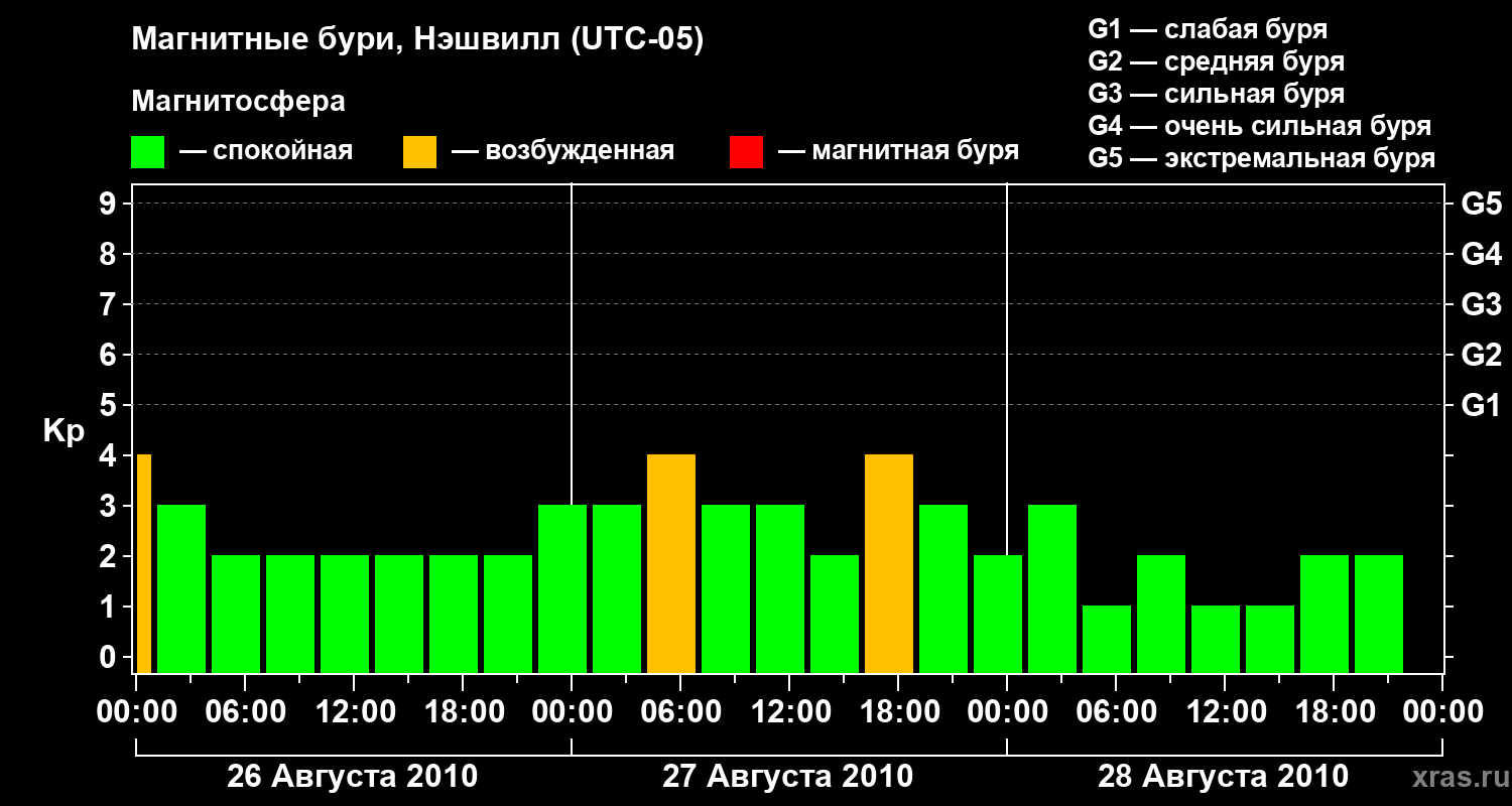 Изменения геомагнитного индекса Kp с 26 по 28 августа 2010 года для средних широт
