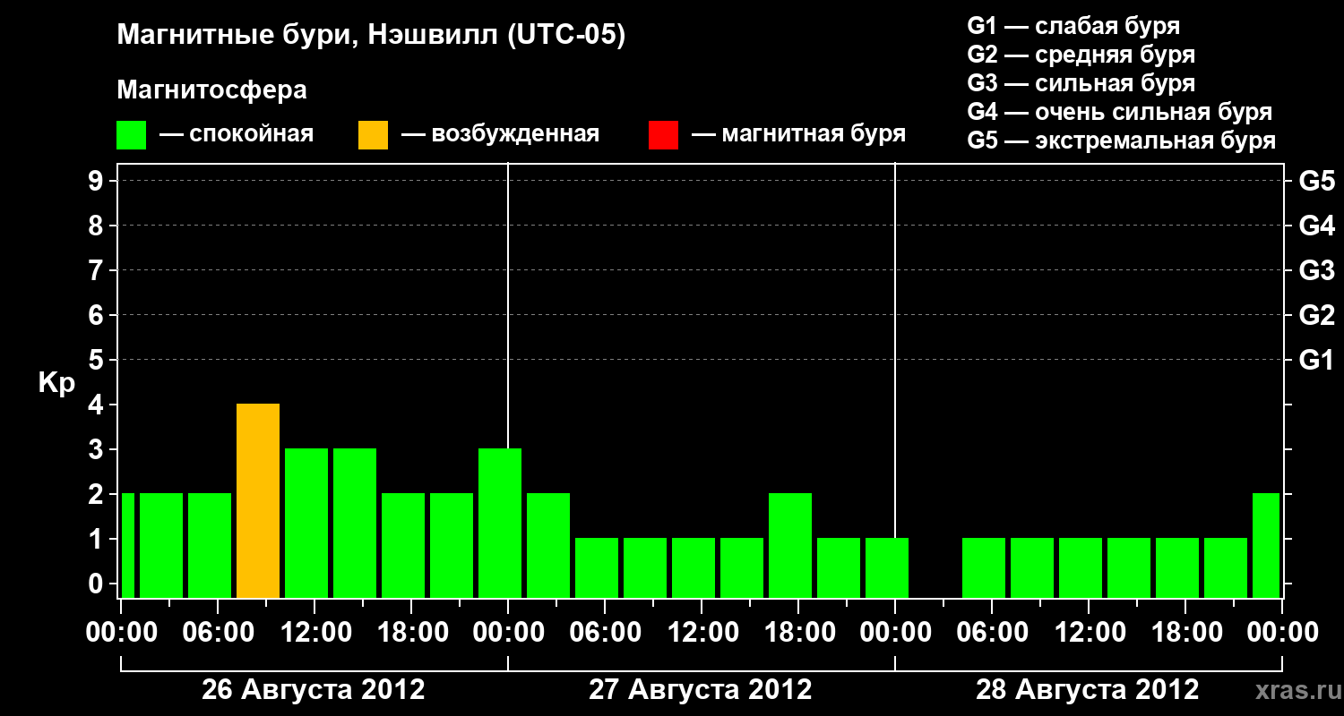 Изменения геомагнитного индекса Kp с 26 по 28 августа 2012 года для средних широт