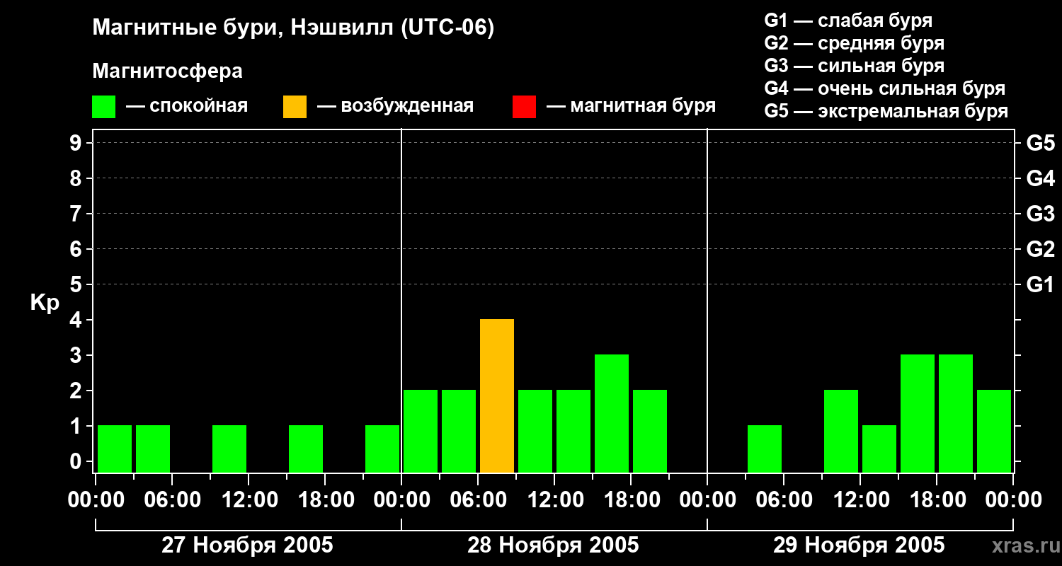 Изменения геомагнитного индекса Kp с 27 по 29 ноября 2005 года для средних широт