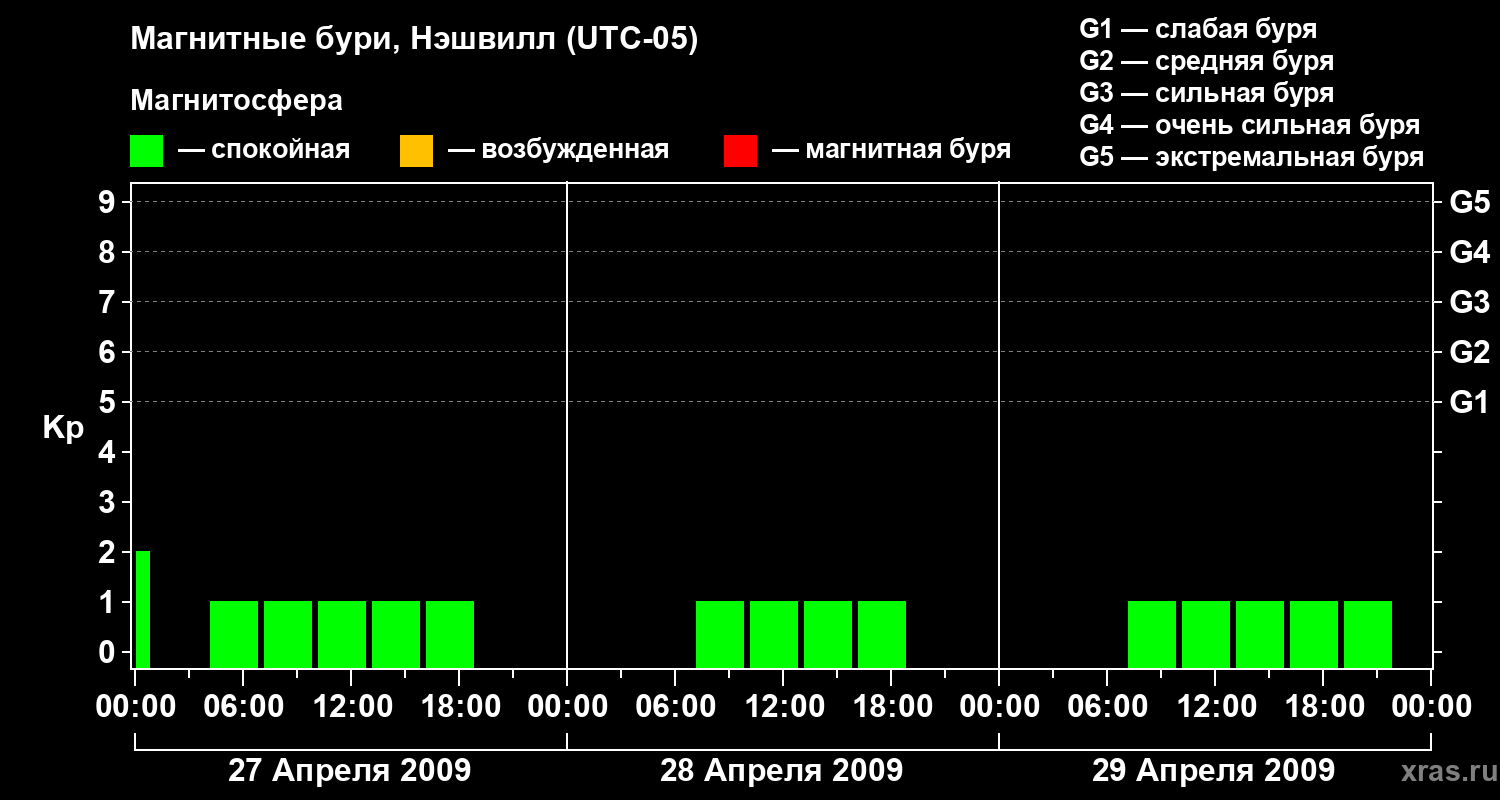Изменения геомагнитного индекса Kp с 27 по 29 апреля 2009 года для средних широт