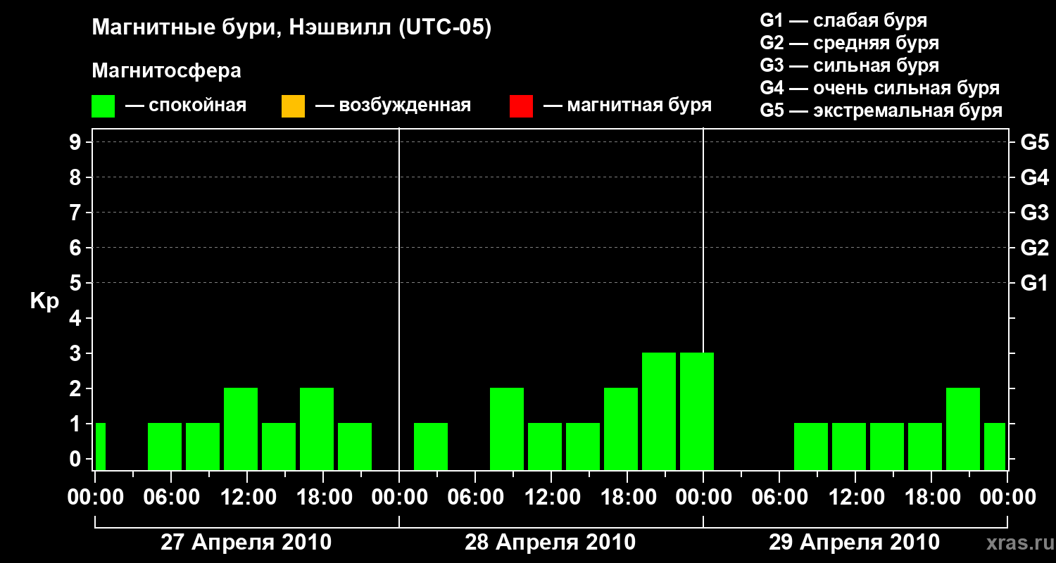 Изменения геомагнитного индекса Kp с 27 по 29 апреля 2010 года для средних широт