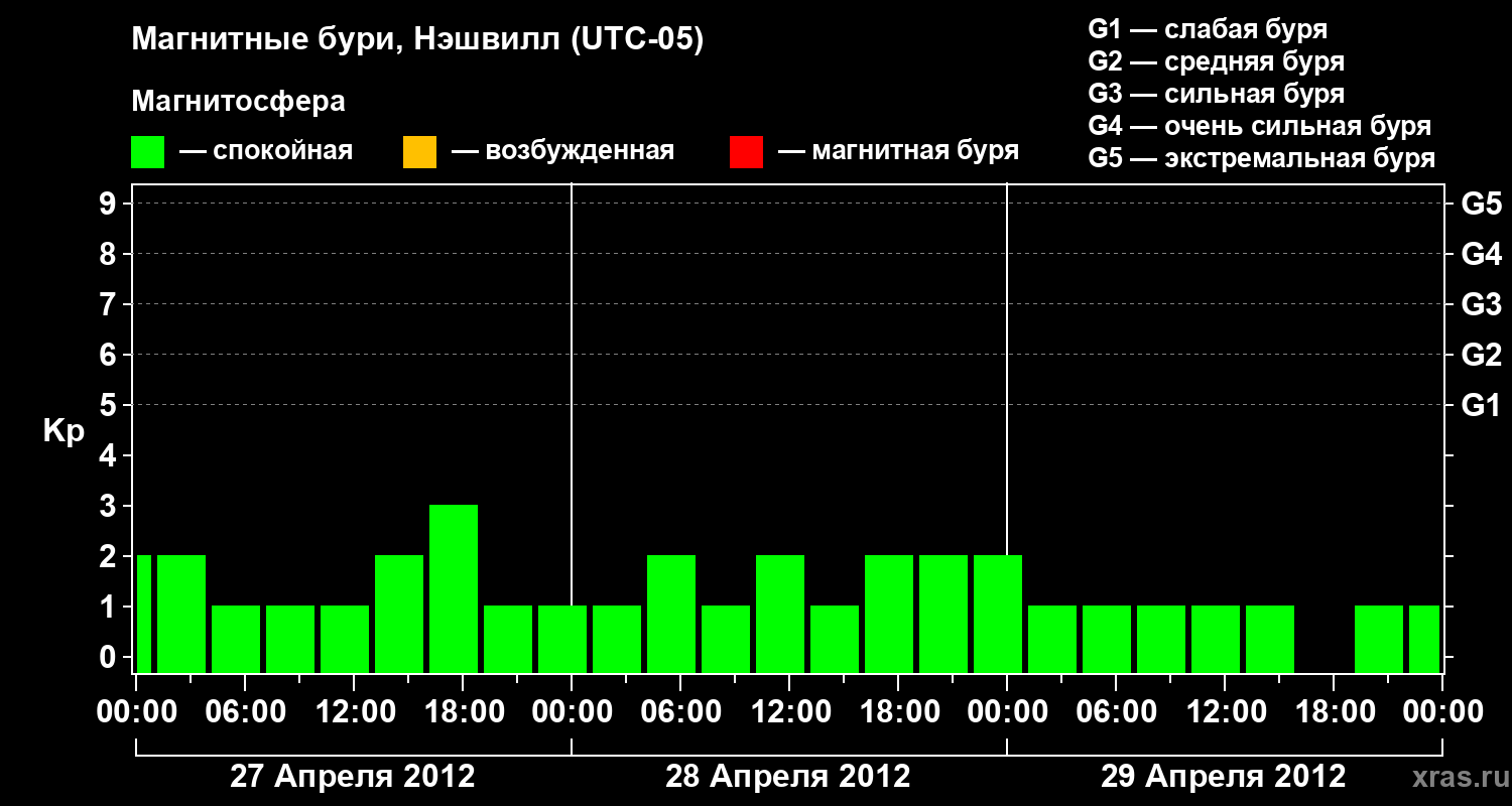 Изменения геомагнитного индекса Kp с 27 по 29 апреля 2012 года для средних широт