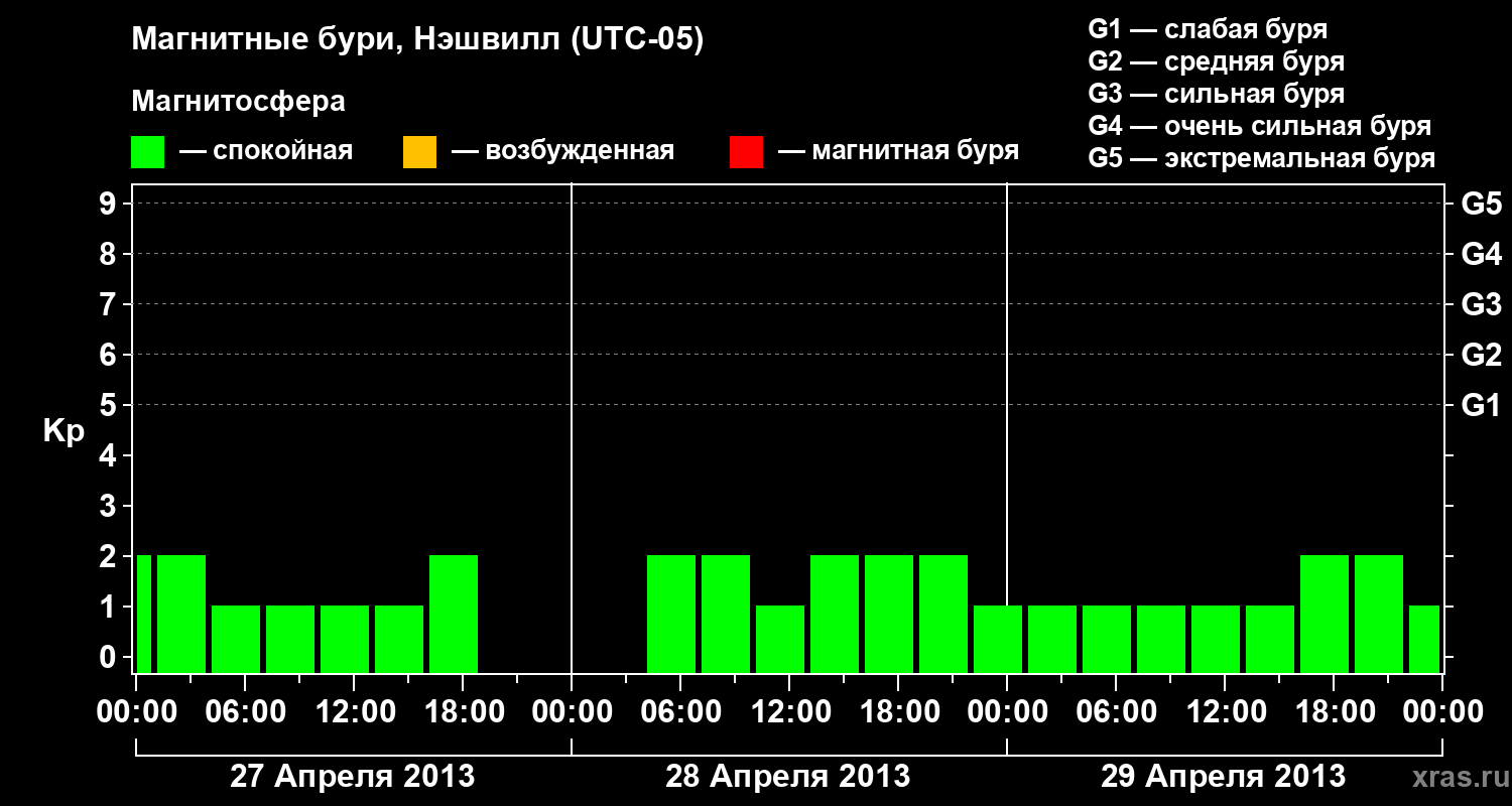 Изменения геомагнитного индекса Kp с 27 по 29 апреля 2013 года для средних широт