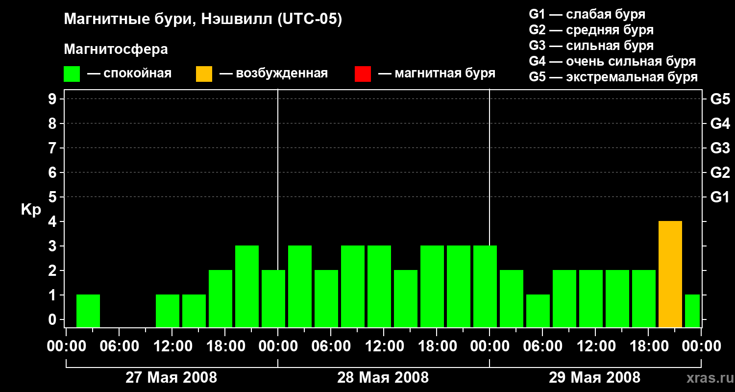 Изменения геомагнитного индекса Kp с 27 по 29 мая 2008 года для средних широт