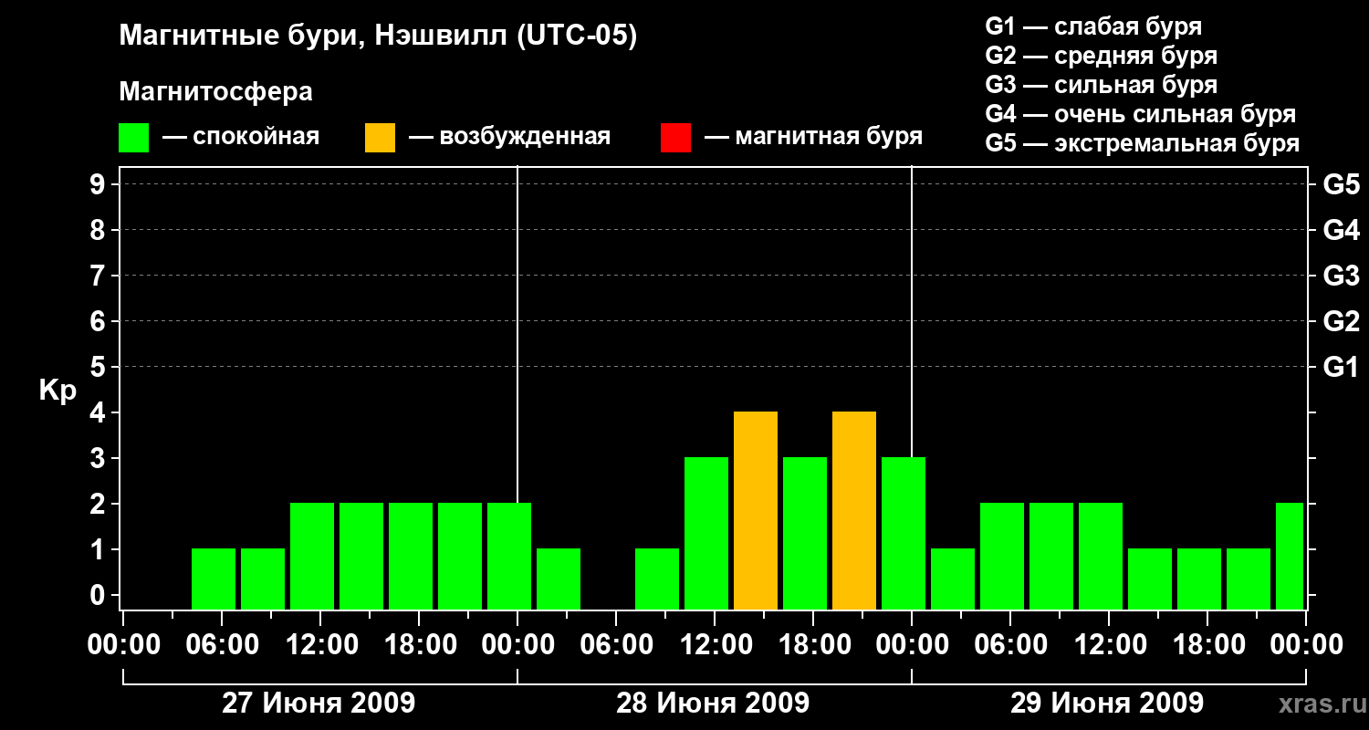 Изменения геомагнитного индекса Kp с 27 по 29 июня 2009 года для средних широт