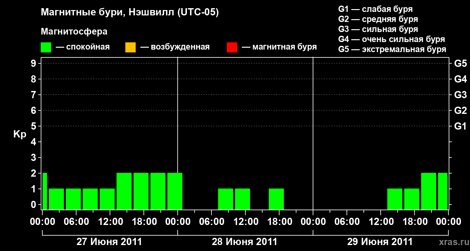 Изменения геомагнитного индекса Kp с 27 по 29 июня 2011 года для средних широт