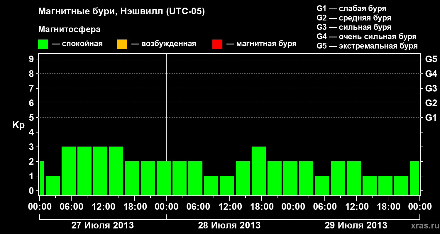 Изменения геомагнитного индекса Kp с 27 по 29 июля 2013 года для средних широт