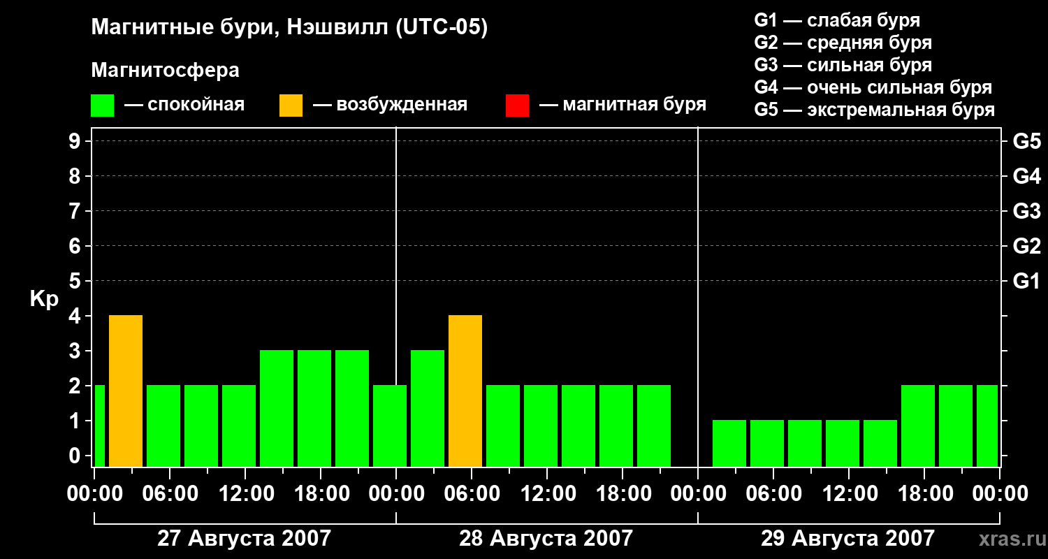 Изменения геомагнитного индекса Kp с 27 по 29 августа 2007 года для средних широт