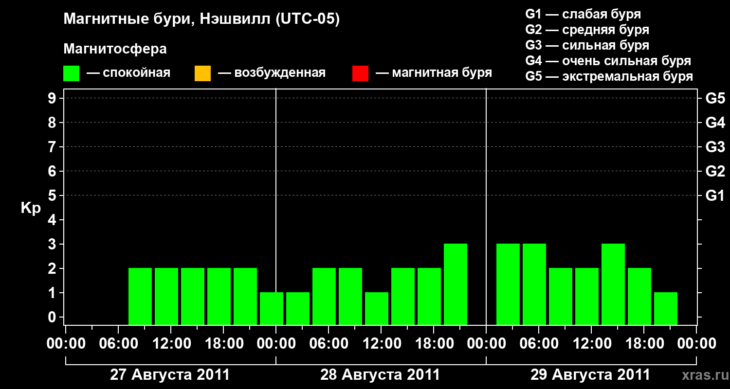 Изменения геомагнитного индекса Kp с 27 по 29 августа 2011 года для средних широт