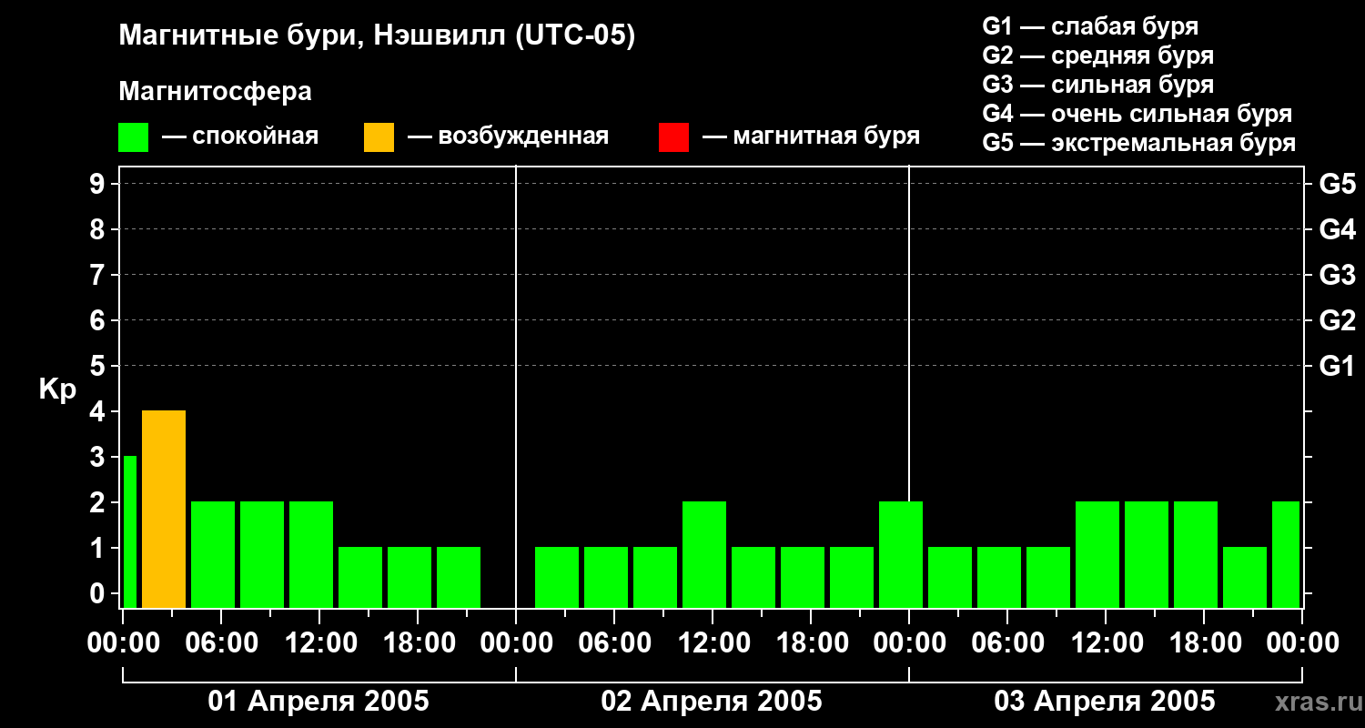 Изменения геомагнитного индекса Kp с 1 по 3 апреля 2005 года для средних широт