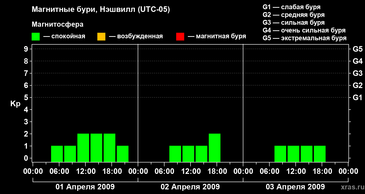 Изменения геомагнитного индекса Kp с 1 по 3 апреля 2009 года для средних широт