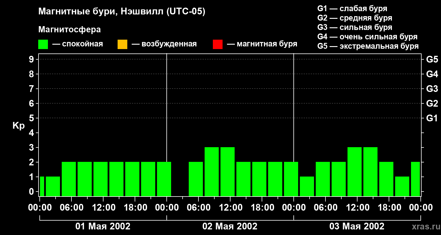 Изменения геомагнитного индекса Kp с 1 по 3 мая 2002 года для средних широт