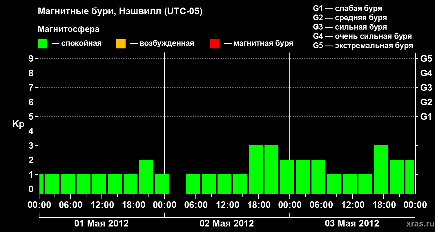 Изменения геомагнитного индекса Kp с 1 по 3 мая 2012 года для средних широт
