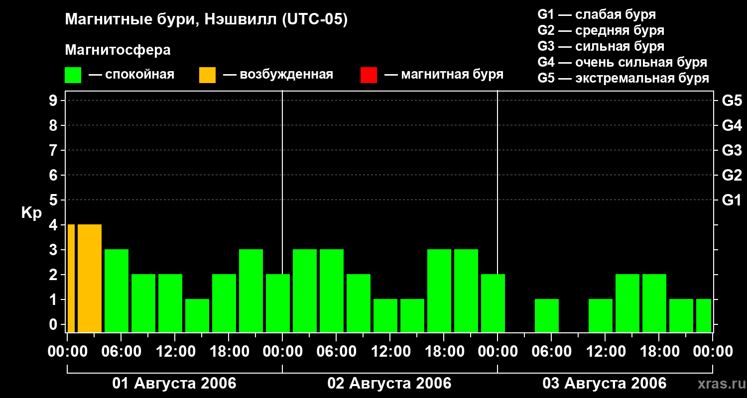 Изменения геомагнитного индекса Kp с 1 по 3 августа 2006 года для средних широт