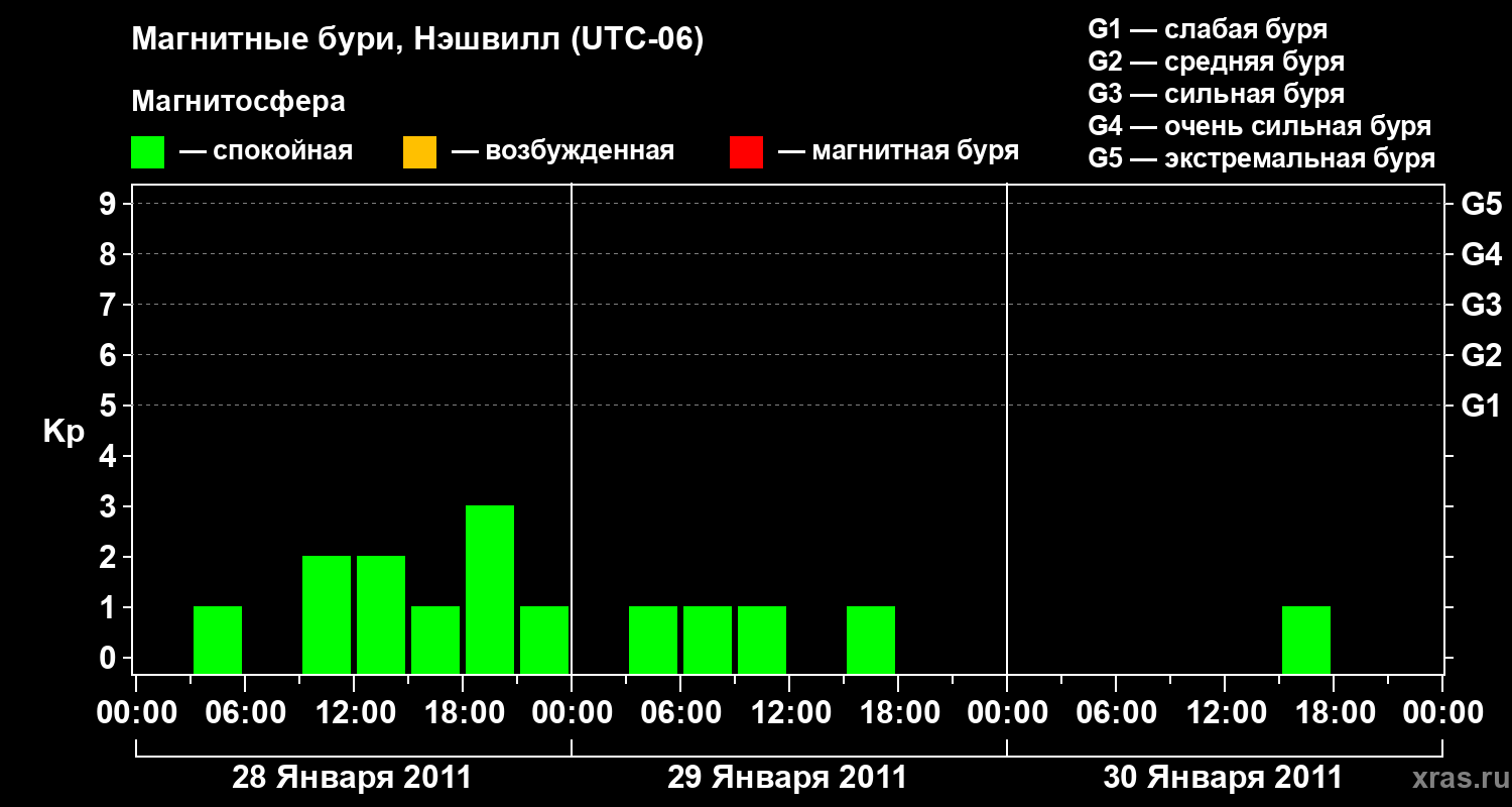 Изменения геомагнитного индекса Kp с 28 по 30 января 2011 года для средних широт