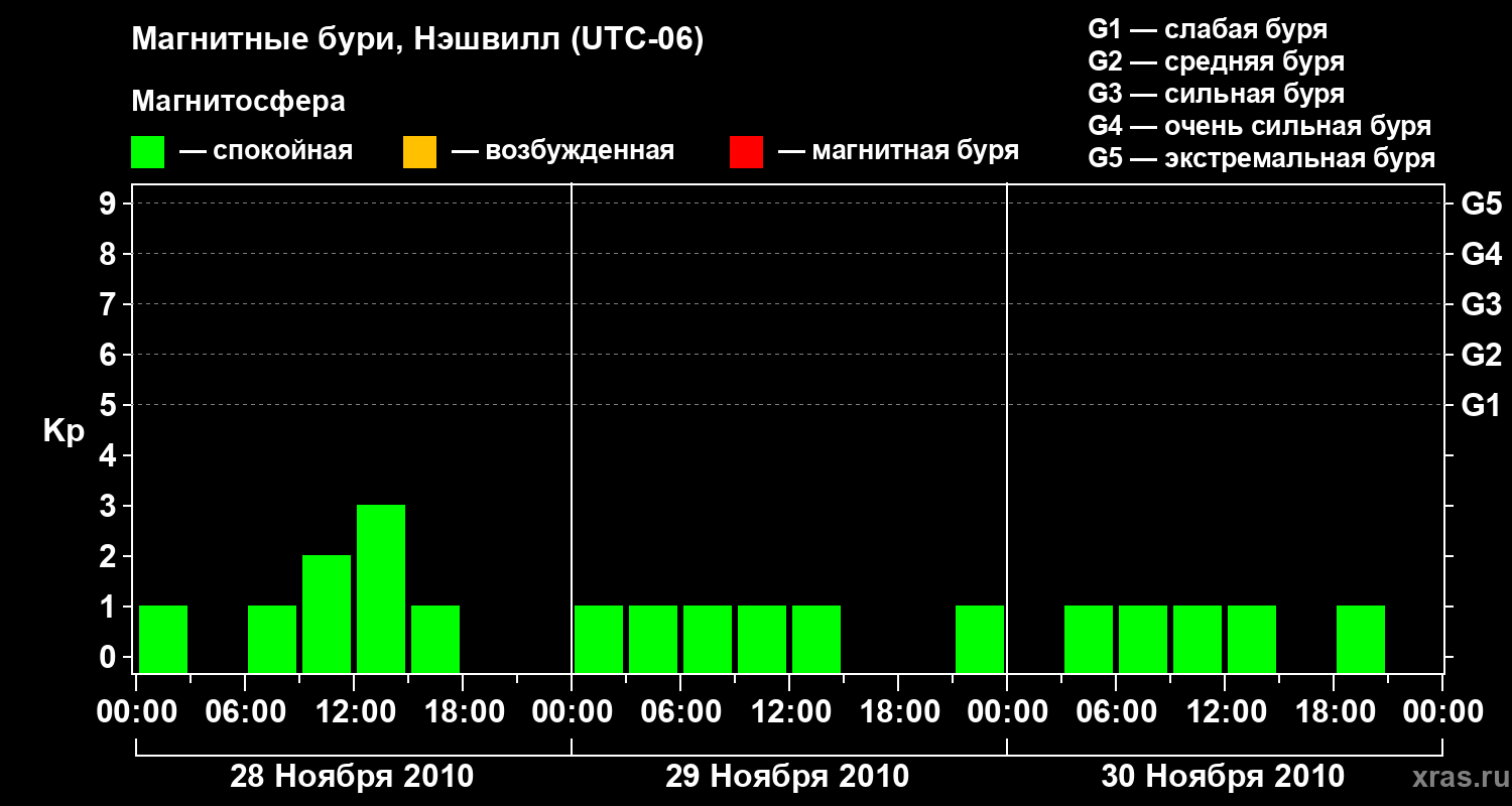 Изменения геомагнитного индекса Kp с 28 по 30 ноября 2010 года для средних широт