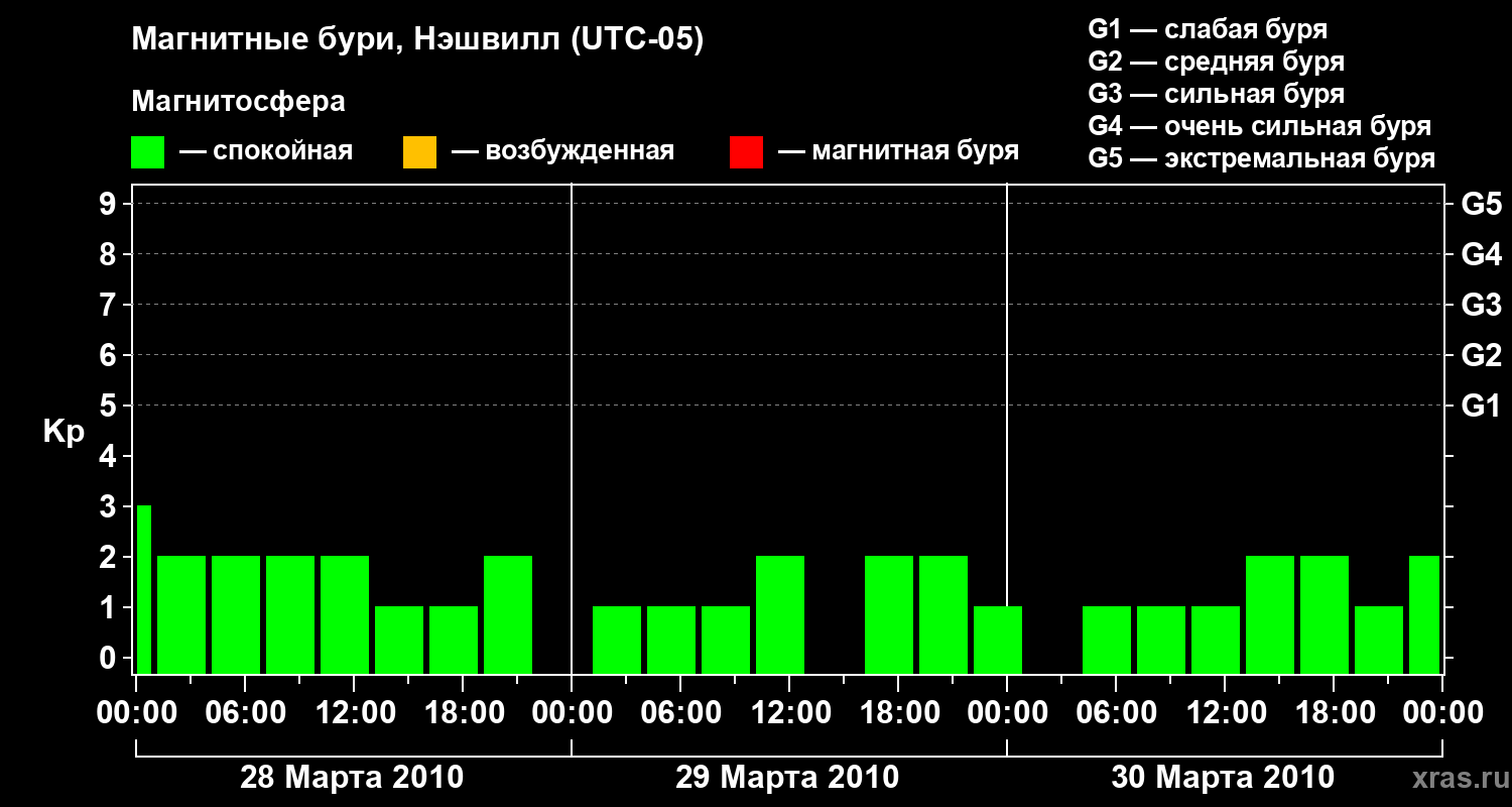 Изменения геомагнитного индекса Kp с 28 по 30 марта 2010 года для средних широт