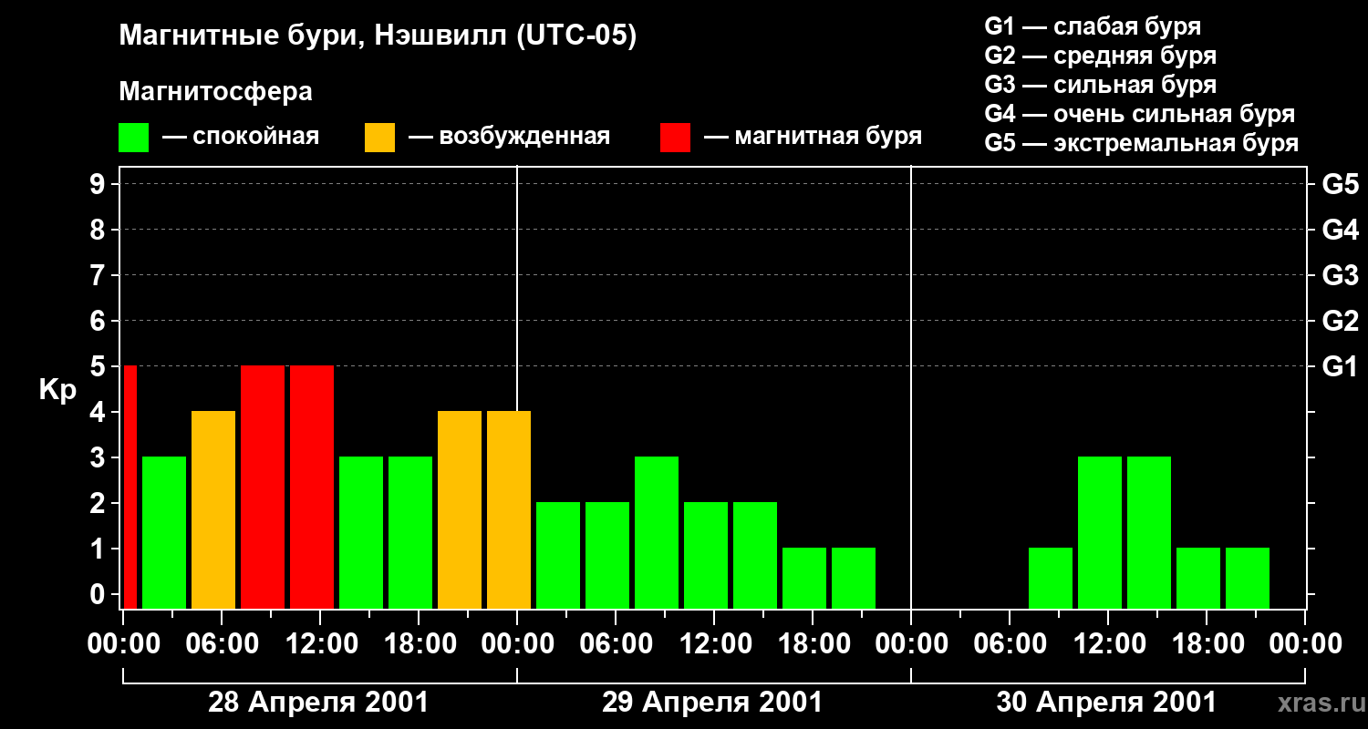 Изменения геомагнитного индекса Kp с 28 по 30 апреля 2001 года для средних широт