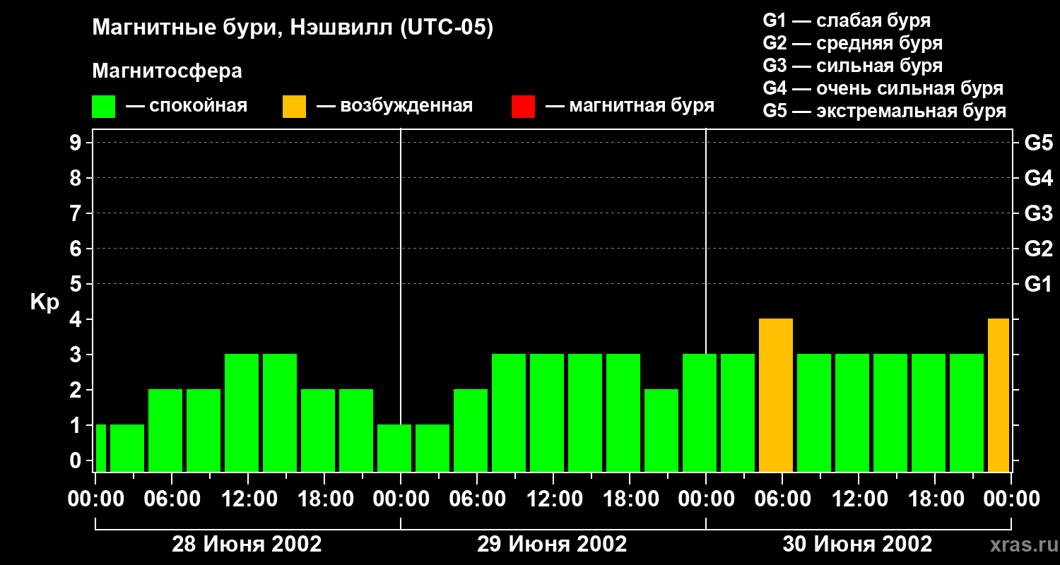 Изменения геомагнитного индекса Kp с 28 по 30 июня 2002 года для средних широт