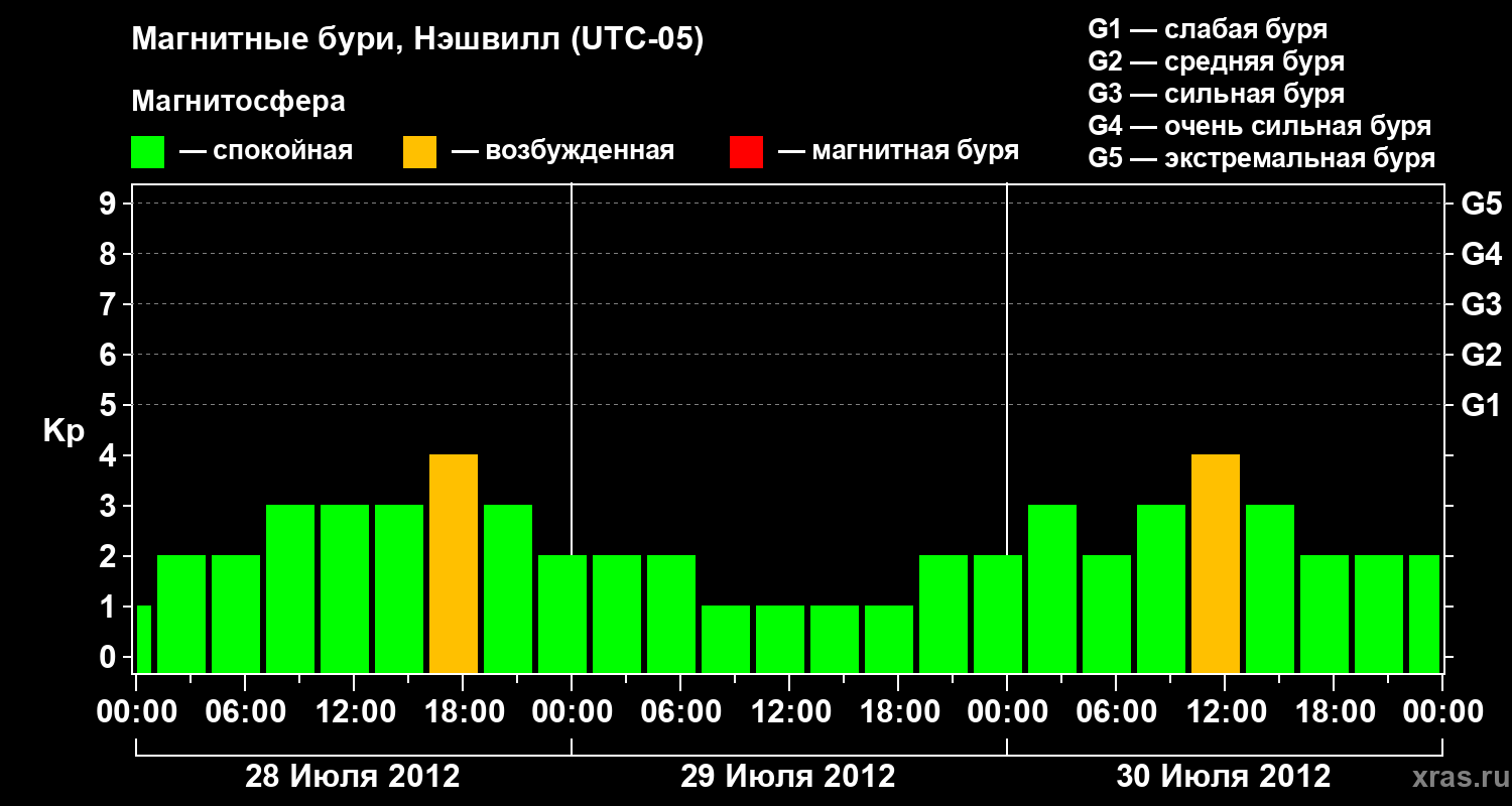 Изменения геомагнитного индекса Kp с 28 по 30 июля 2012 года для средних широт