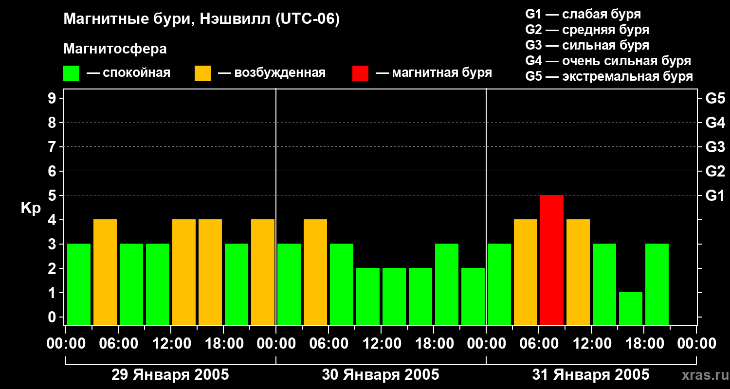 Изменения геомагнитного индекса Kp с 29 по 31 января 2005 года для средних широт