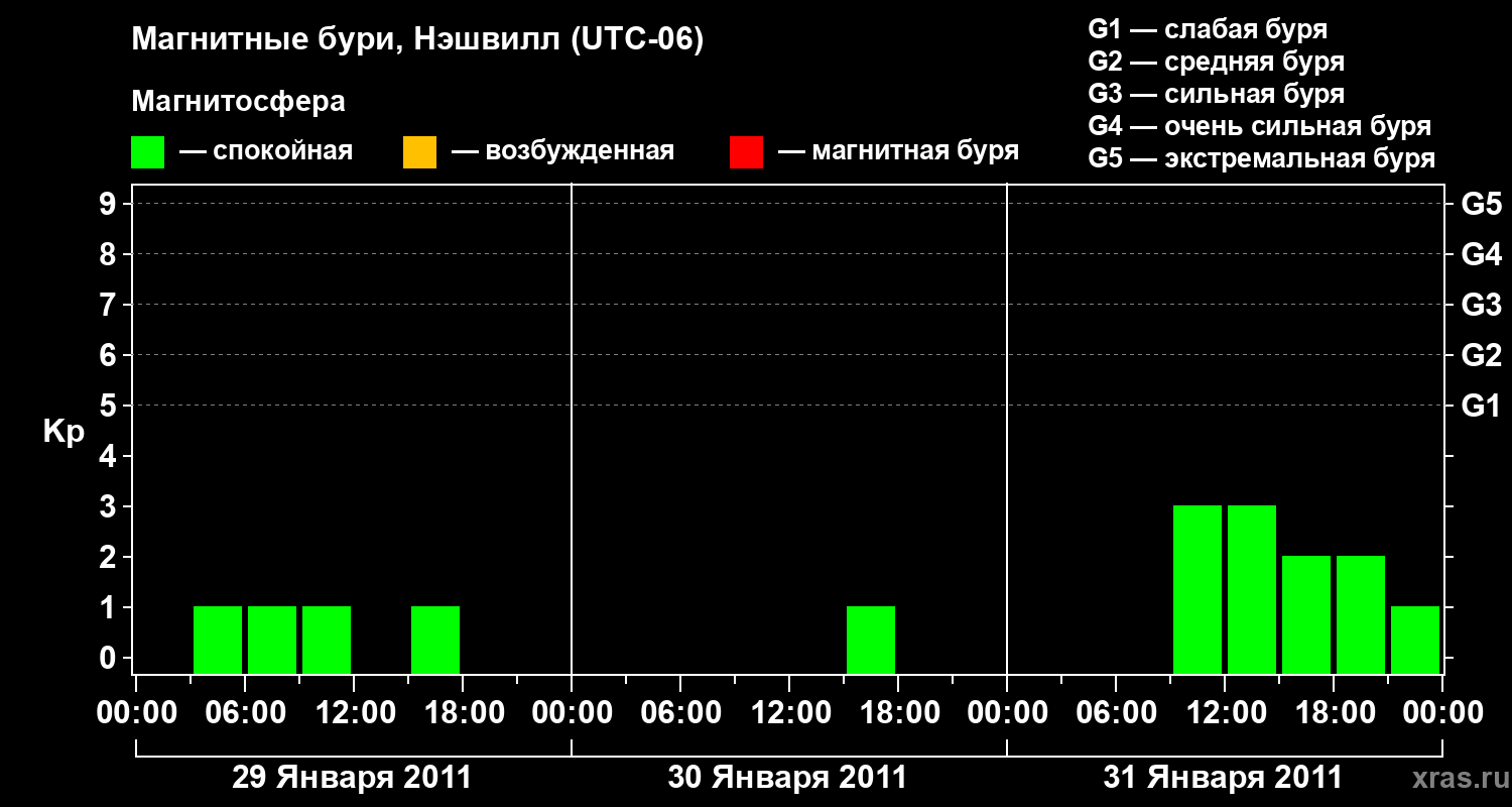 Изменения геомагнитного индекса Kp с 29 по 31 января 2011 года для средних широт