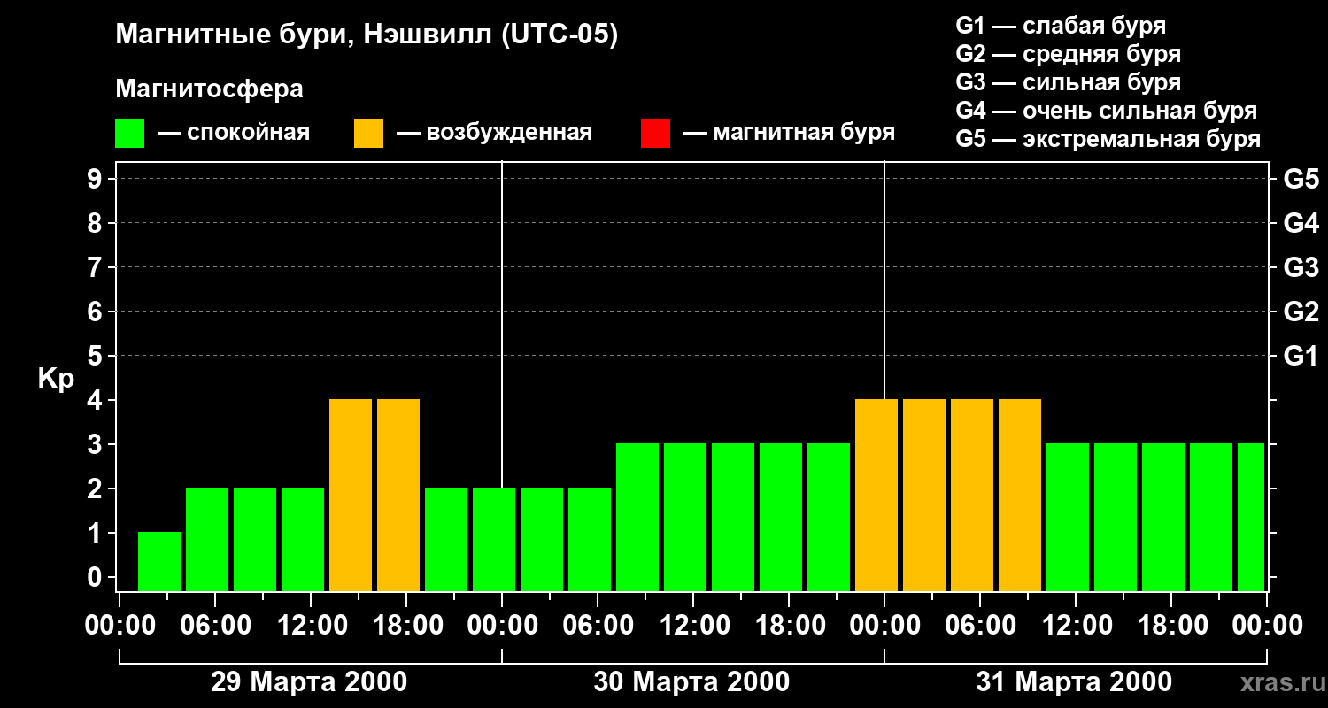 Изменения геомагнитного индекса Kp с 29 по 31 марта 2000 года для средних широт