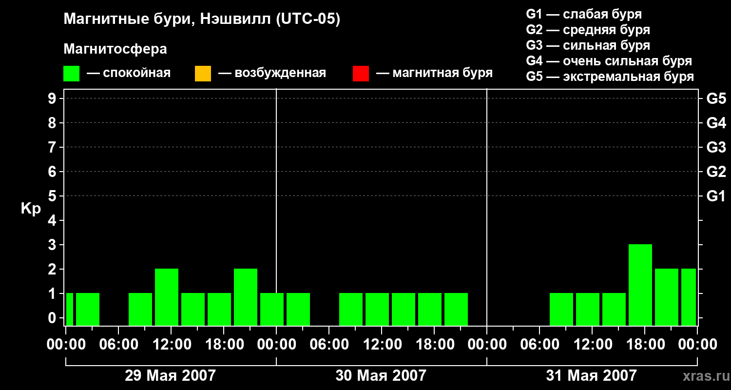 Изменения геомагнитного индекса Kp с 29 по 31 мая 2007 года для средних широт
