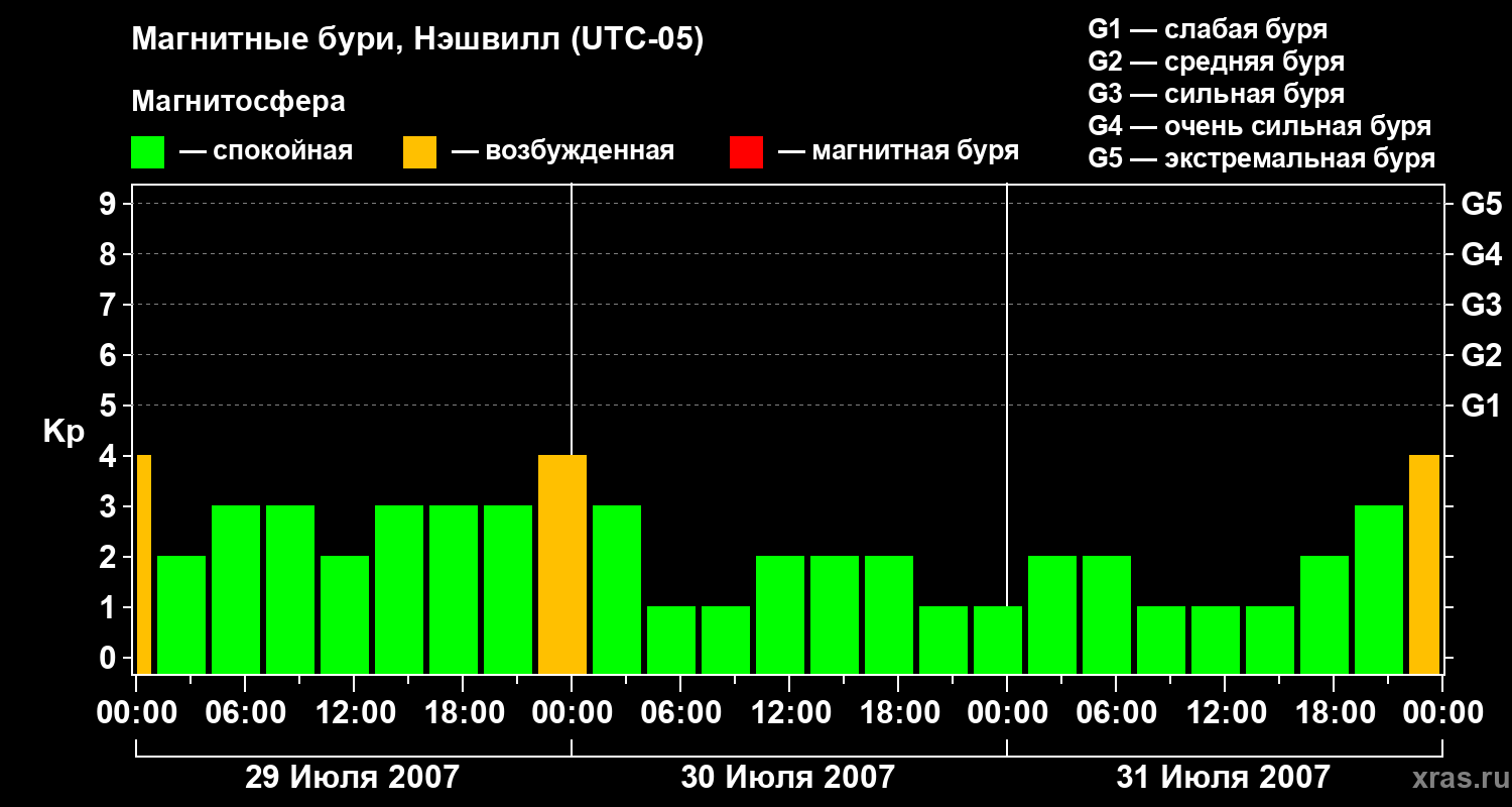 Изменения геомагнитного индекса Kp с 29 по 31 июля 2007 года для средних широт