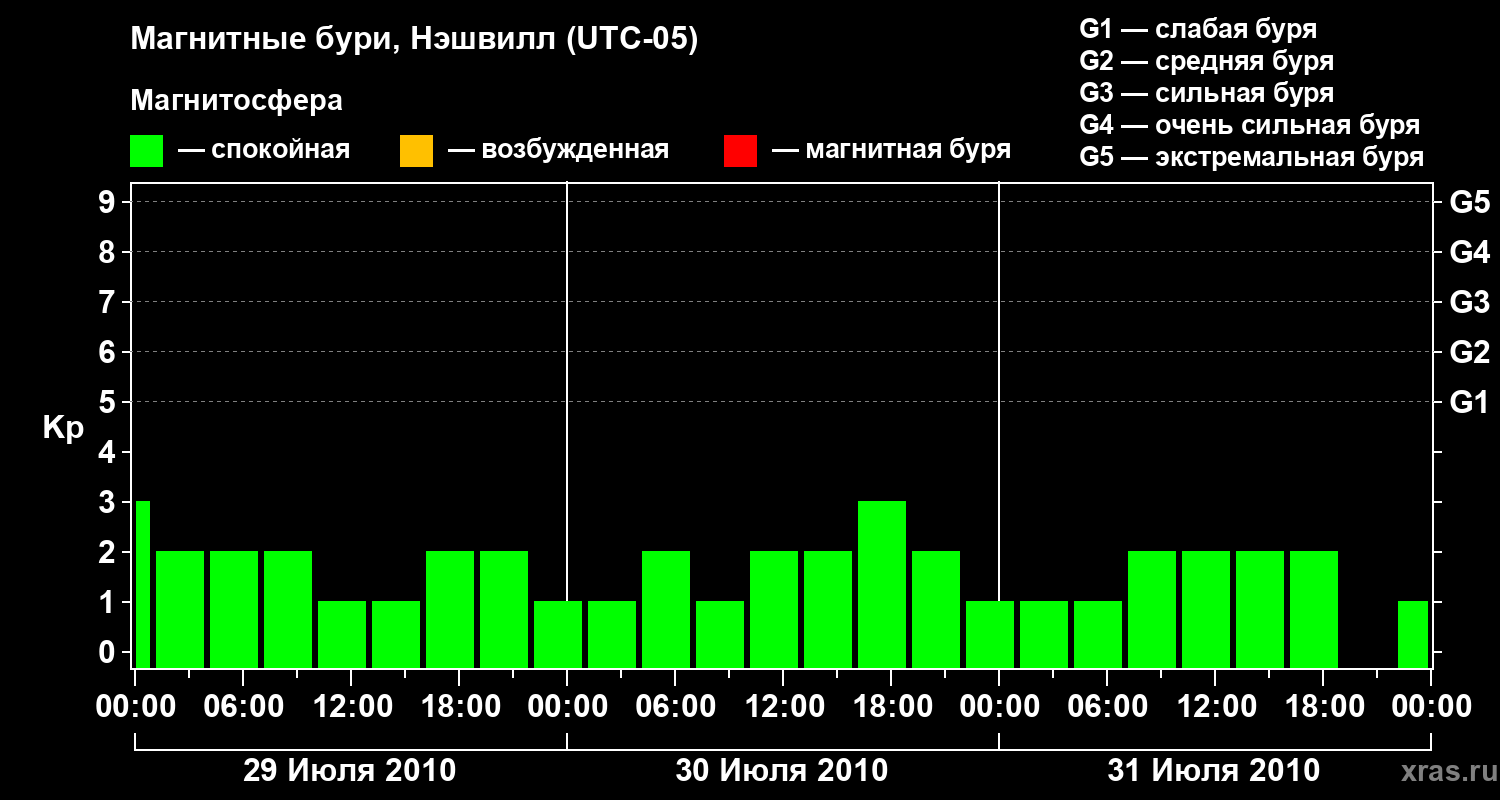 Изменения геомагнитного индекса Kp с 29 по 31 июля 2010 года для средних широт